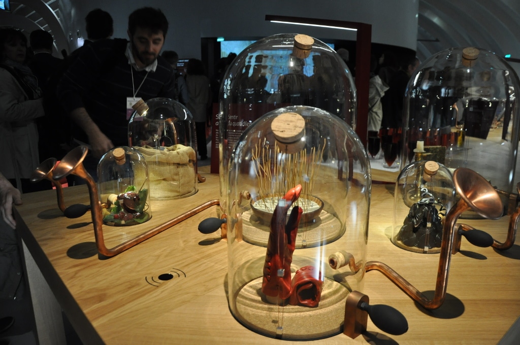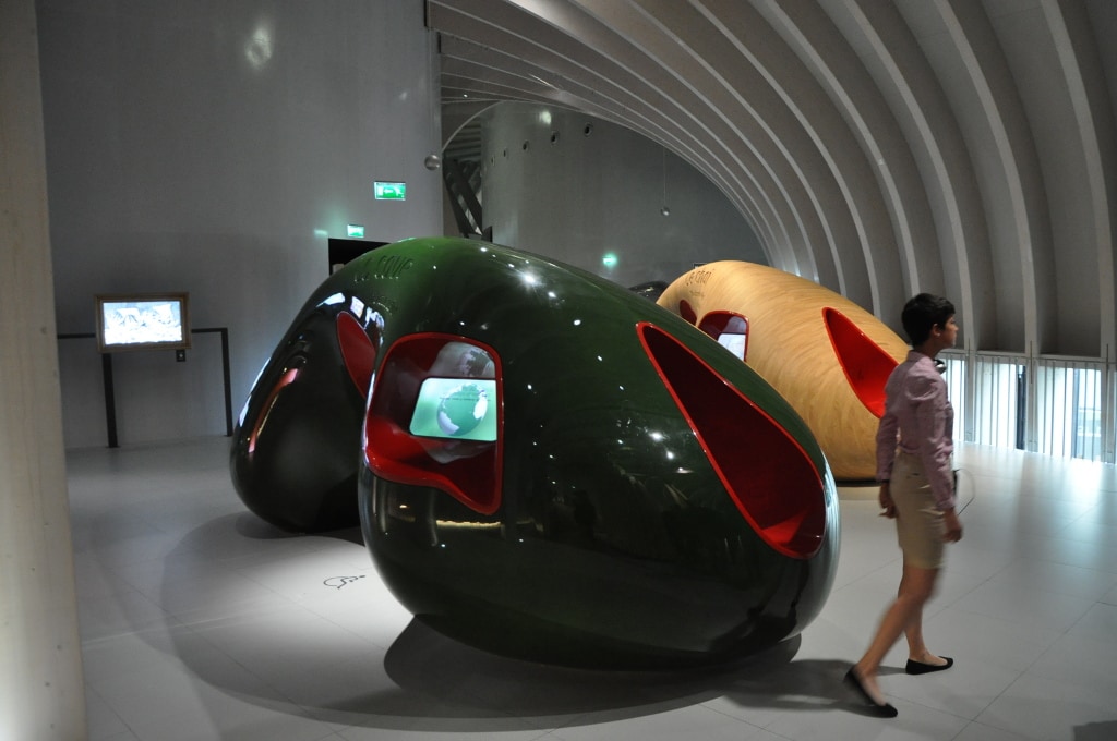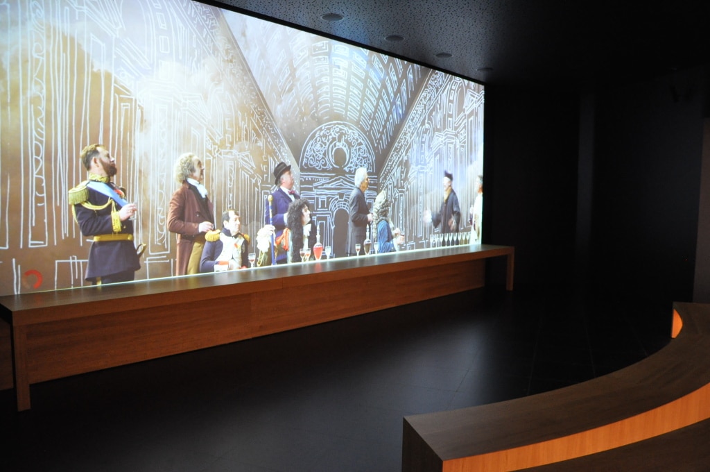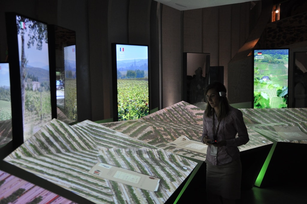 Surtout, la Cité du Vin table sur son parcours permanent de 3000 m². Ici, on ne parle pas de salle d’expos mais de « modules » qui sont « poly-sensoriels » insiste notre guide. Chacun a son utilisation du numérique : des paysages viticoles projetés au sol, des globes interactifs lient le vin au patrimoine, au climat et à l’économie, ailleurs les paysages se transforment sous les doigts des visiteurs, des bouteilles géantes s’ouvrent sur des tables tactiles et des diffuseurs de parfums ou encore un espace – pour adulte – parle vin, art et érotisme.