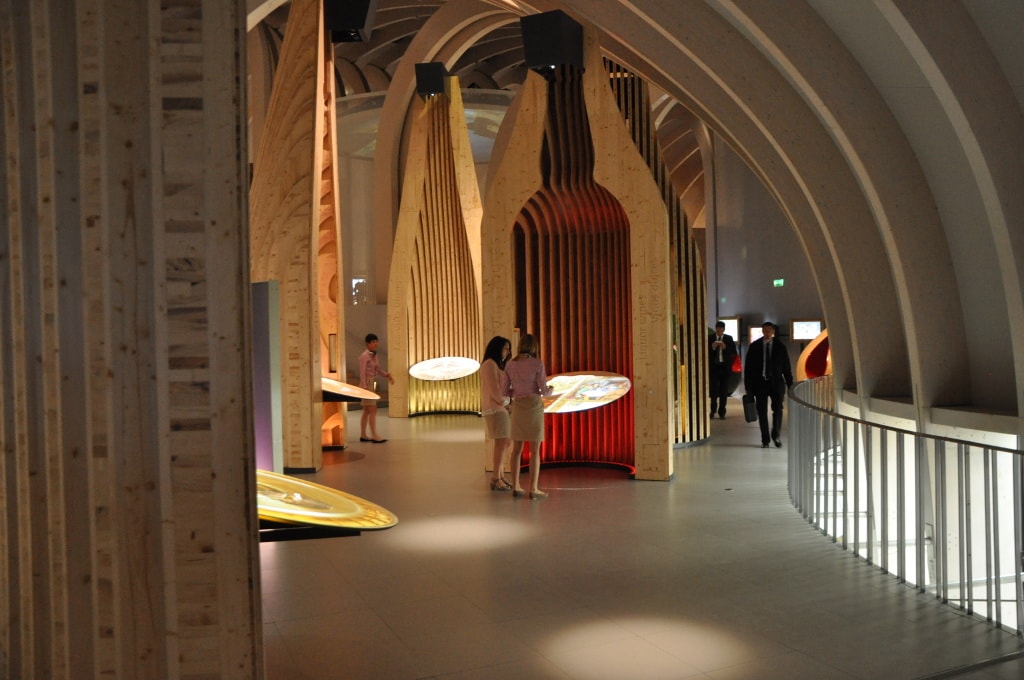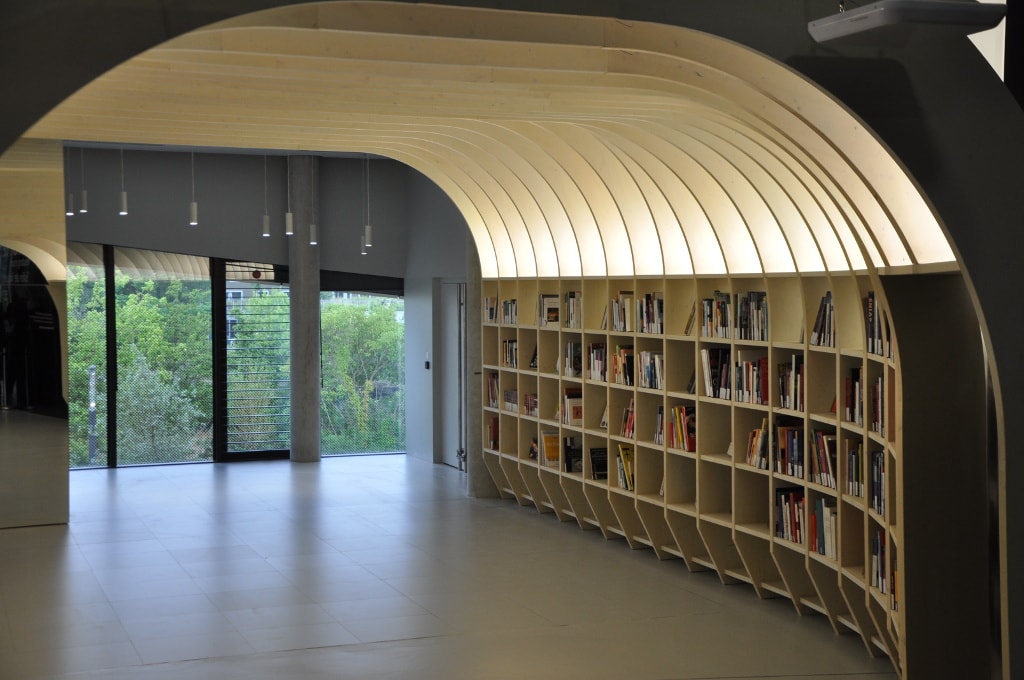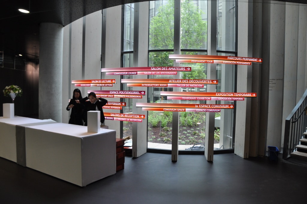 L’audioguide – ici on dit un « compagnon de voyage » – se pose sur les esgourdes, mais orienté vers l’extérieur, pour que vous puissiez parler avec votre compagnon de voyage physique (autrement dit amis, familles, voisins…). Tout ça pour 20 euros accompagné d’une dégustation sur le belvédère. Les radins ou fauchés pourront se contenter des parties ouvertes à tous, c’est-à-dire le rez-de-chaussée (avec boutiques, bars et caves aux 12000 bouteilles) et le premier étage, où se trouve le salon de lecture ou une terrasse, dont la vue est moins épatante, il faut bien le dire, qu’au 7e et dernier étage, où se trouve le restaurant panoramique.