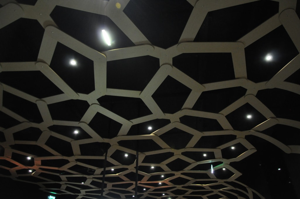 A l’intérieur, le lieu garde ses courbes avantageuses, le bois et surtout les écrans et tablettes numériques sont à l’honneur, quoique dans une ambiance un peu sombre.