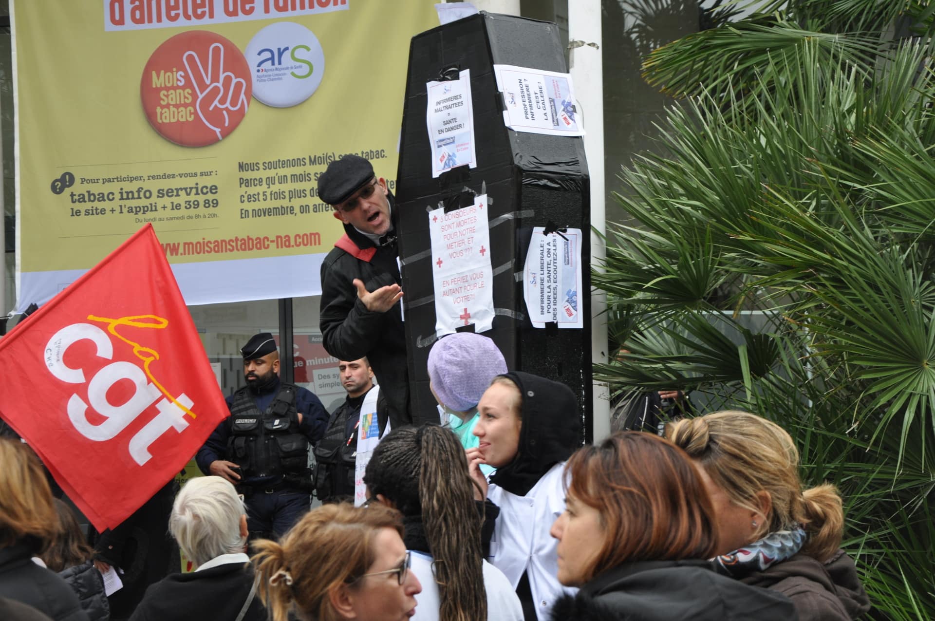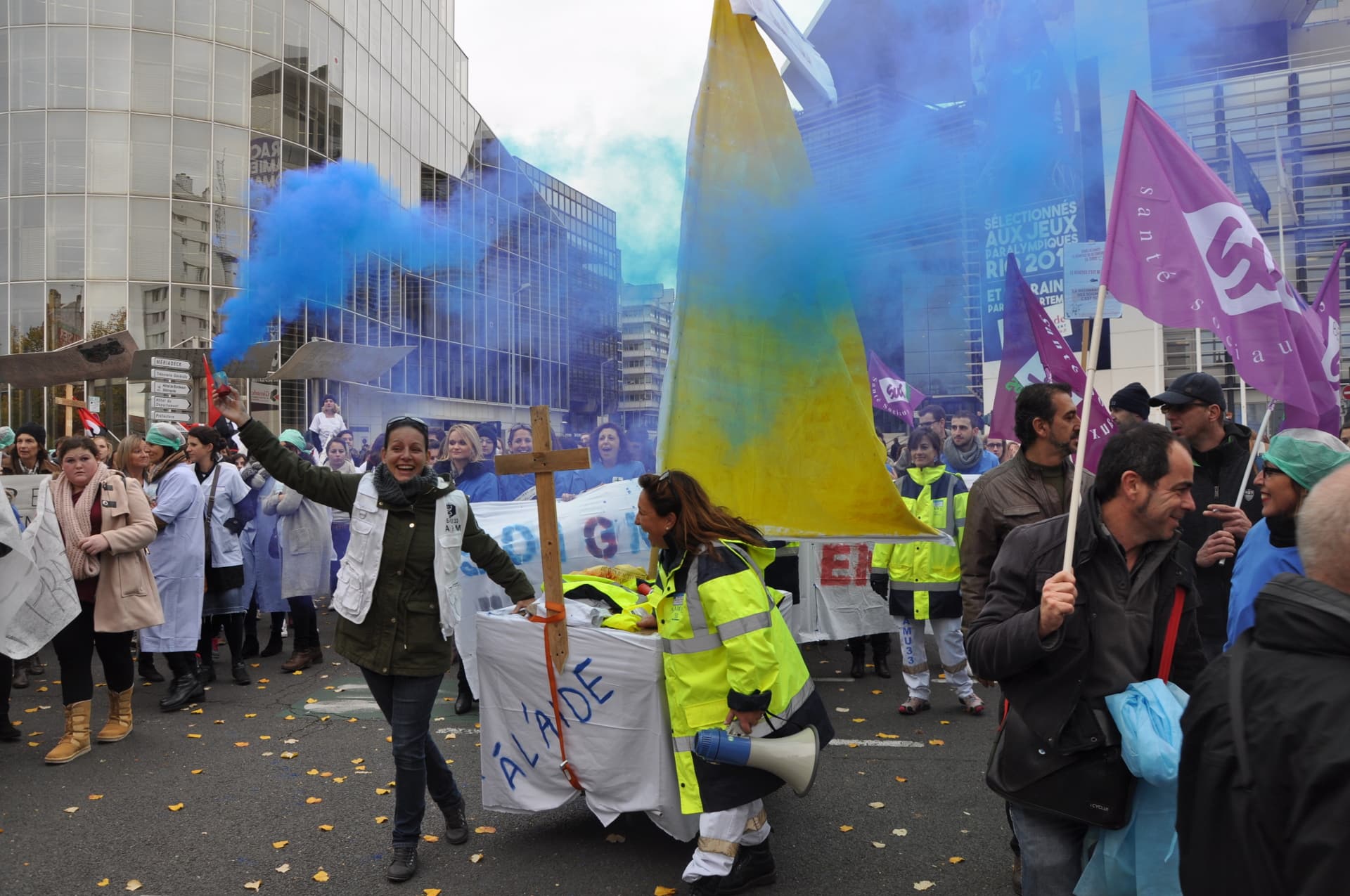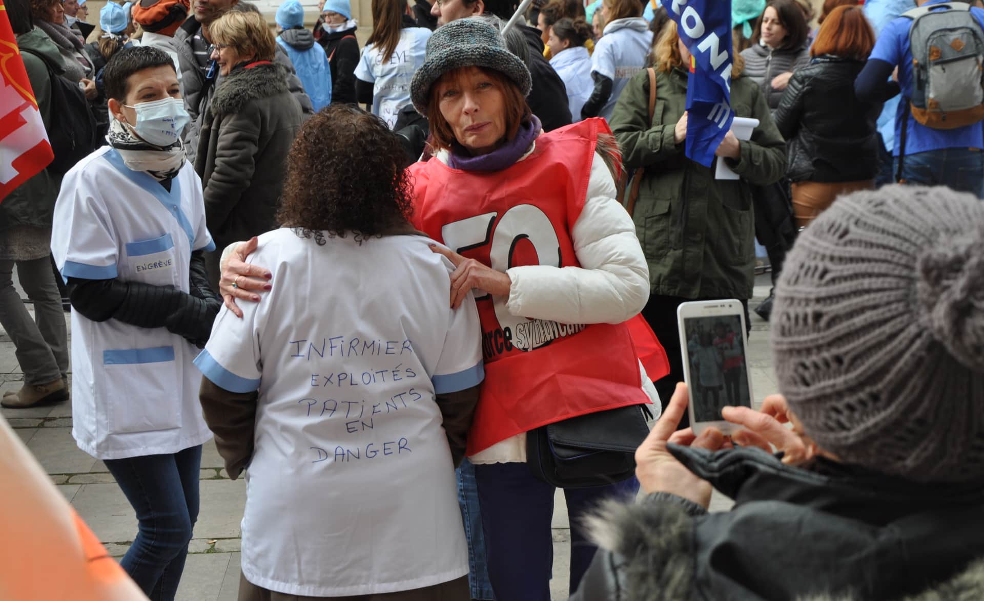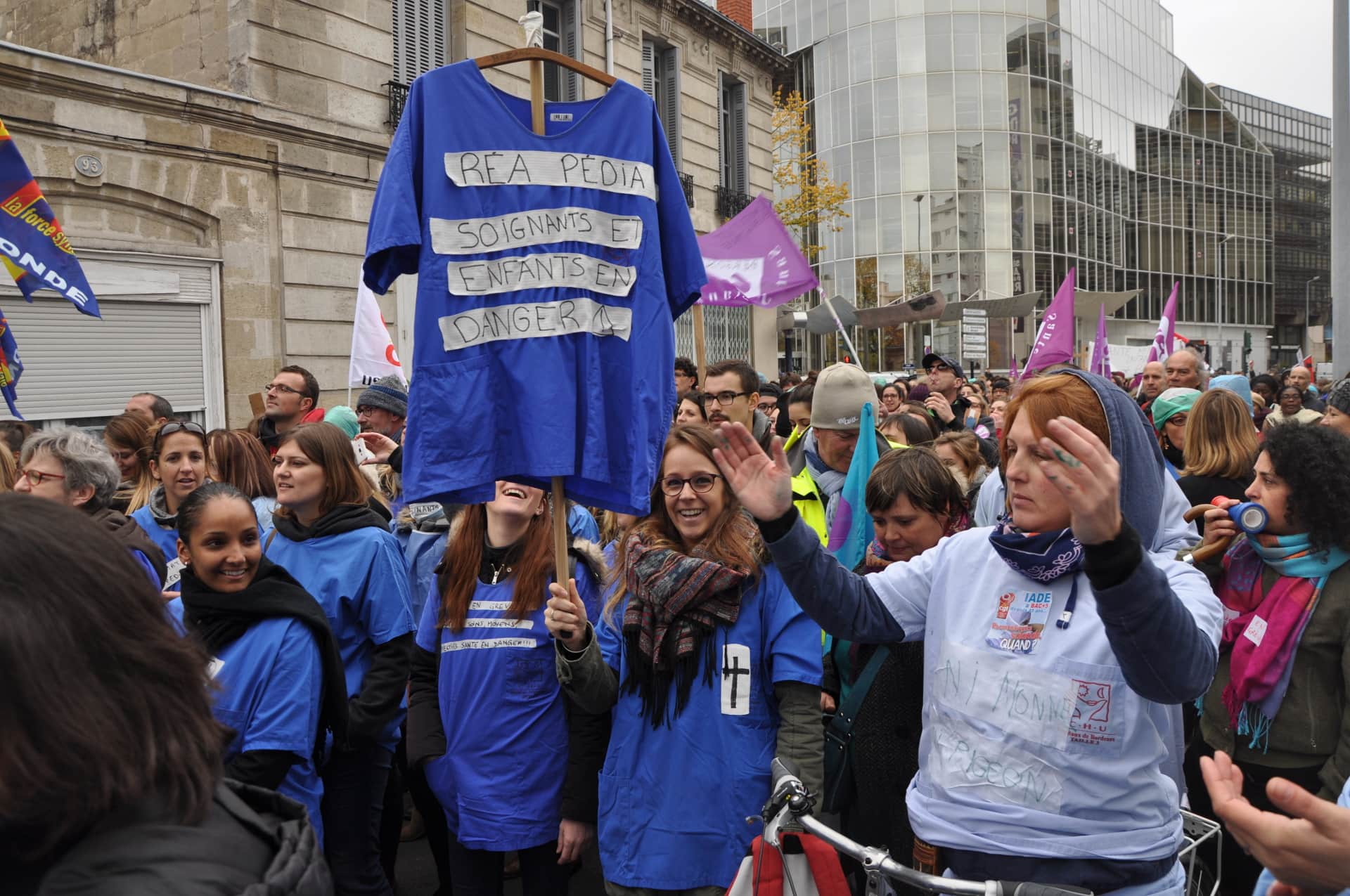 Devant l’hôpital Saint-André, un camion de pompiers entre sous les applaudissements de plus d’un millier d’infirmiers. Il active un coup de sirène en réponse. Il y a là des blouses bleues ou blanches mais aussi les drapeaux et chasubles des syndicats Force Ouvrière et CGT (dont celle du secrétaire national Philippe Martinez, venu au congrès de l’union départementale de Gironde). Carine, infirmière non-syndiquée, est rêveuse :