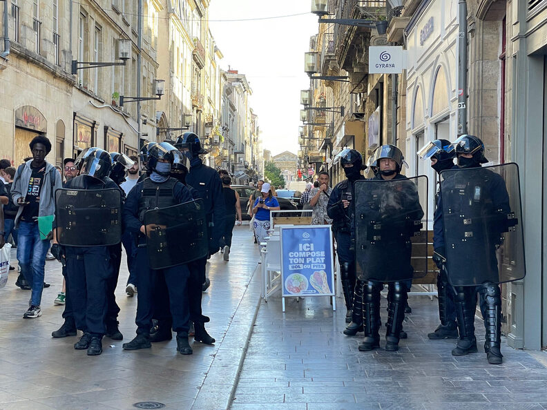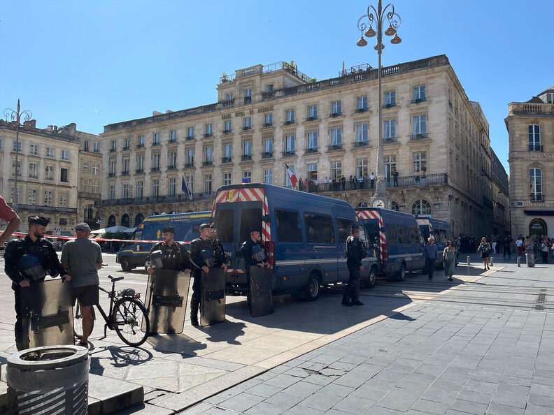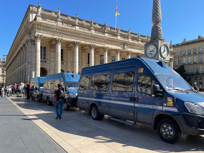 Place de la Comédie, les forces de l’ordre contrôlent l’accès à la rue Sainte-Catherine et au quartier piéton où se concentrent les commerces. Il en sera sans doute de même du côté de la place de la Victoire.