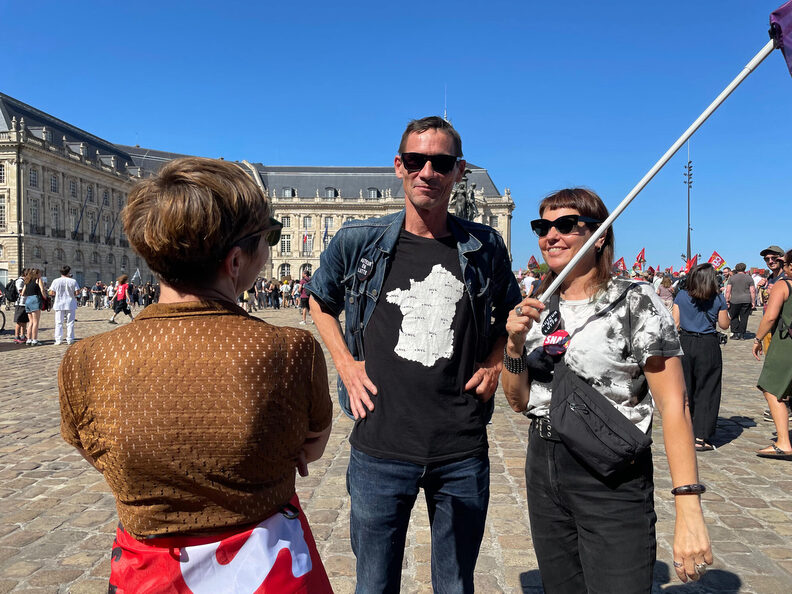 À Bordeaux, les artistes sont aussi dans la rue ce 18 septembre. Derrière le cortège du syndicat des auteurs plasticiens, rattaché à la CGT Spectacle, Karinka et Benjamin ont pris la parole pour rappeler l’inquiétude du monde culturel. Tous deux plasticiens, ils dénoncent les coupes budgétaires qui frappent de plein fouet leurs activités, en particulier la réduction brutale des financements liés au Pass Culture Pro.