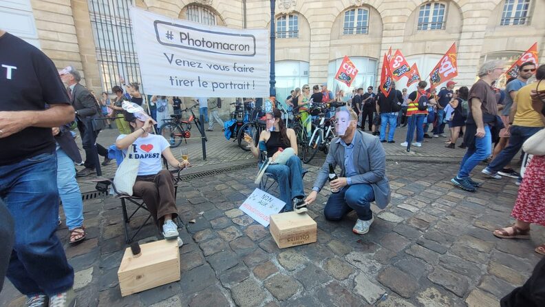 Se faire un « photomacron », un cirage de pompes… en buvant une coupe de champagne, voilà de quoi mettre les personnes venues manifester dans l’ambiance des revendications de cette manifestation du 18 septembre.