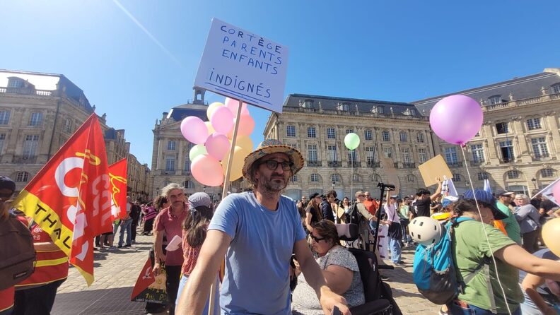 Un groupe inédit a fait son apparition dans le cortège bordelais : celui des « parents et enfants indignés ». Créé à l’initiative de mères et de pères réunis sur un groupe en ligne, il entend offrir un espace sécurisé pour manifester avec ses enfants, aux côtés de l’Assemblée féministe girondine.