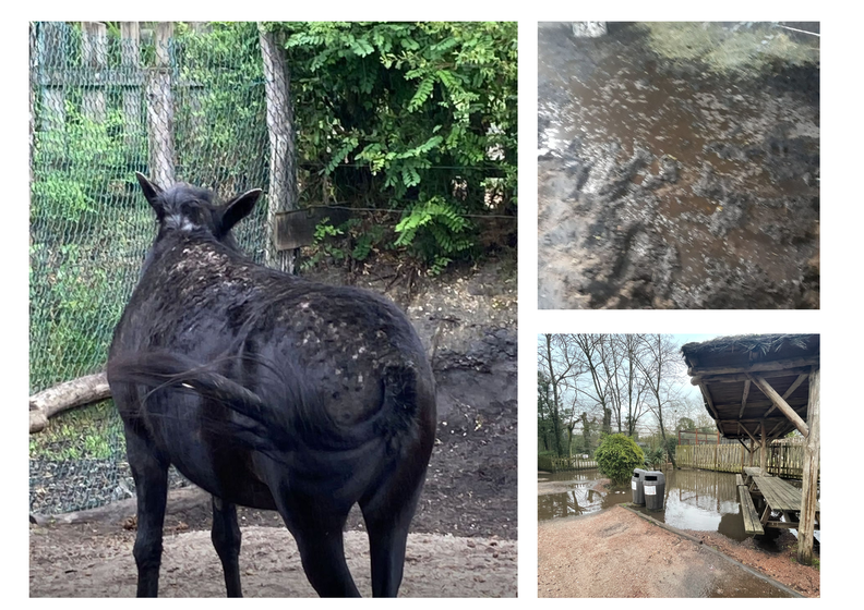 « À l’hiver 2023-2024, les allées et plusieurs enclos étaient inondés, y compris celui des gibbons, et à force de rester dans la boue, le mulet a fini par développer la gale ; dès mon arrivée, on pariait déjà sur qui serait le prochain à démissionner », témoigne un employé en poste entre 2023 et 2025. Photo : Documents remis