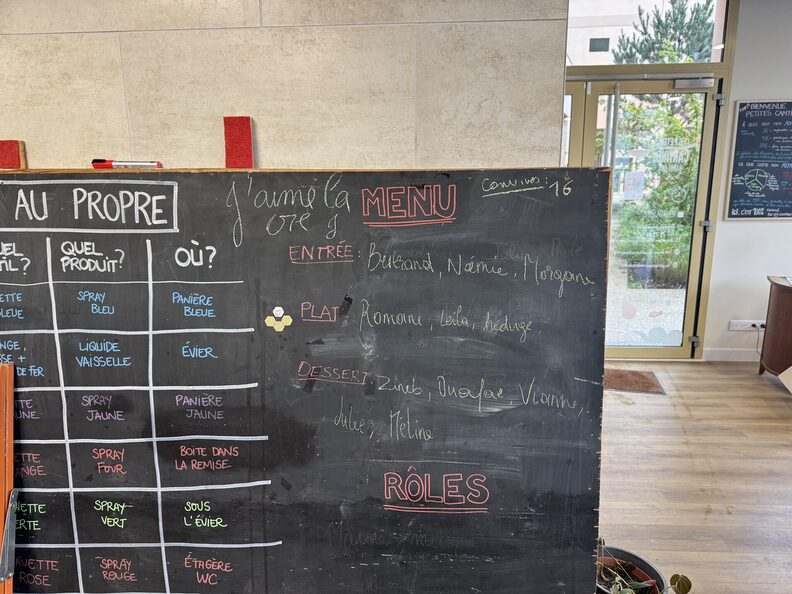 Autour d’un café, chacun fait connaissance. Les restes de dessert de la veille circulent. Ce matin-là, certains avaient même apporté des gâteaux maison, comme Leïla, qui découvrait la cantine pour la première fois. L’ambiance est déjà conviviale : tout le monde se tutoie rapidement. Bertrand, chef cuisinier, arrive les bras chargés de légumes et de fruits fraîchement achetés au marché.